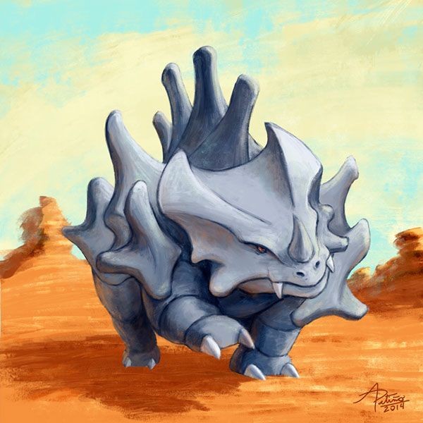 *_Descrição_: Rhyhorn é um Pokémon rinoceronte que é completamente cinza com placas de pedra em todo seu corpo como se usasse uma armadura natural em seu corpo. Rhyhorn não é considerado um pokémon tão famoso, mais ele é bem famoso na região de Kalos sendo usado como montaria pras famosas Corridas de Rhyhorn (claramente inspirado nas corridas de bicicleta da França).*