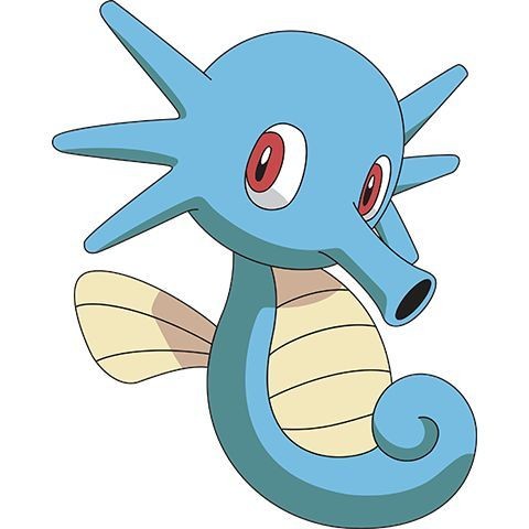 *_Descrição_: Horsea é um pokémon cavalo marinho com pele azul claro com uma barriga amarelada e olhos vermelhos. Esse Pokémon apesar de não ter um move que represente essa habilidade dele mais ele consegue disparar tinta de sua boca, habilidade essa só apresentada no anime de Pokémon.*