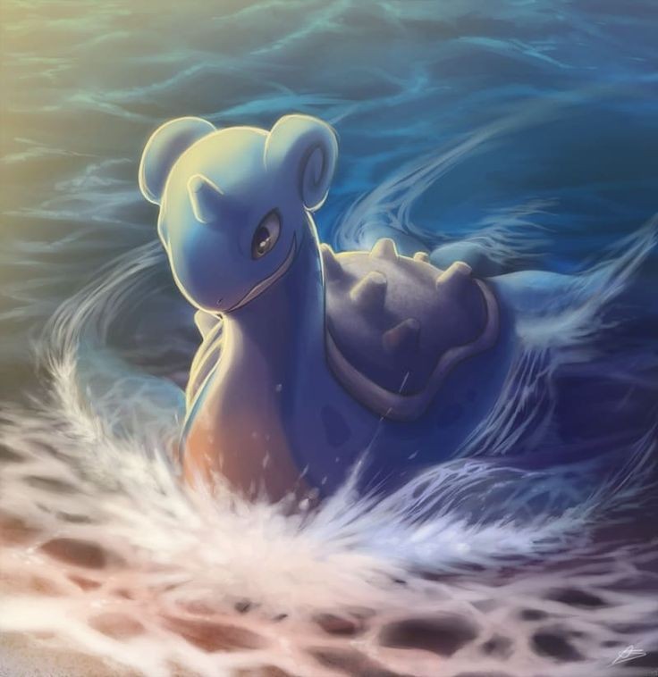 *Descrição: Lapras é um Pokémon reptiliano marinho que se assemelha a um plesiossauro. Tem uma pele azul com manchas azuis mais escuras e uma parte inferior de cor creme. Tem grandes olhos castanhos, um chifre curto na testa e orelhas bem enroladas. Tem um pescoço comprido e quatro barbatanas. As barbatanas anteriores são maiores do que as posteriores. No seu dorso tem uma carapaça pesada e cinzenta coberta de botões rombos.*