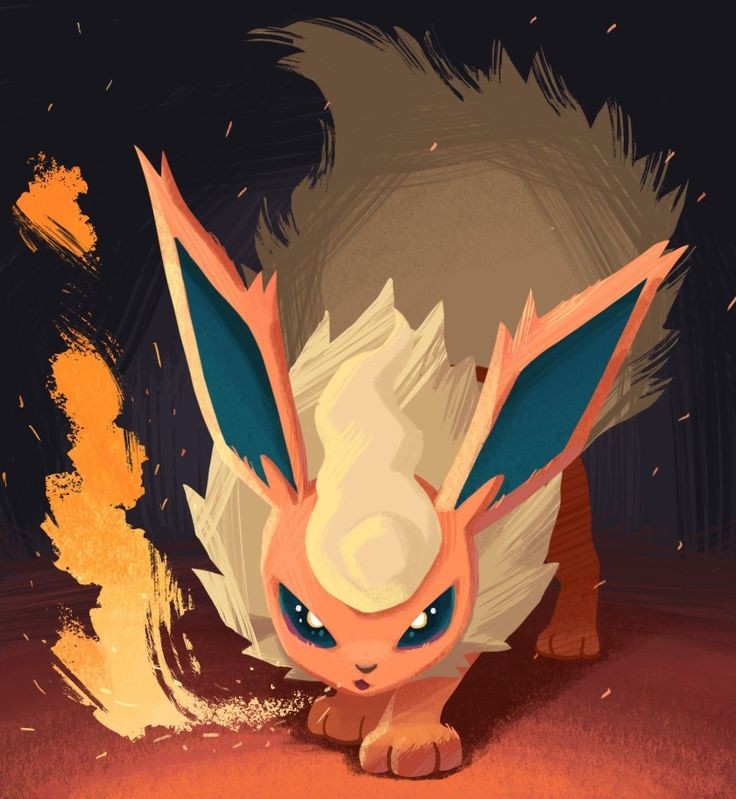 *_Descrição_: Flareon tem uma pelagem laranja com uma cauda felpuda amarelada junto de sua juba e a ponta de sua cabeça amarelados com aspectos de fogo, esse Pokémon no passado do RPG era um Tanker de um certo líder de ginásio que misericórdia,nos jogos em geral ele é o mais fraco, mais aqui ele tem grandes chances de ser a Eeveelution mais forte.*