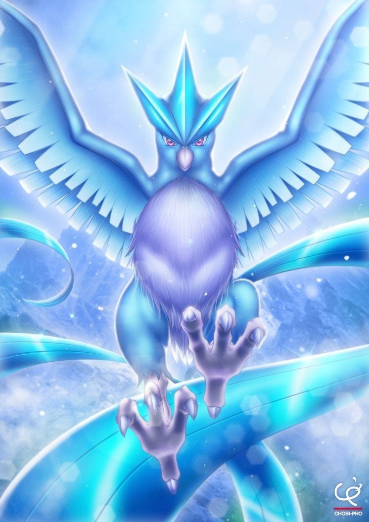*_Descrição_: Articuno toma a forma de um grande pássaro de plumagem predominantemente azul. Sua coloração é um ciano em sua cauda serpentina com uma crista na cabeça. Sua crista na cabeça é simples, consistindo de três em forma de losango de penas em sua testa. Seu corpo é um azul céu, crescendo mais leve no peito da barriga. Sua característica mais marcante são as suas grandes asas, que parecem que são feitas de gelo.*