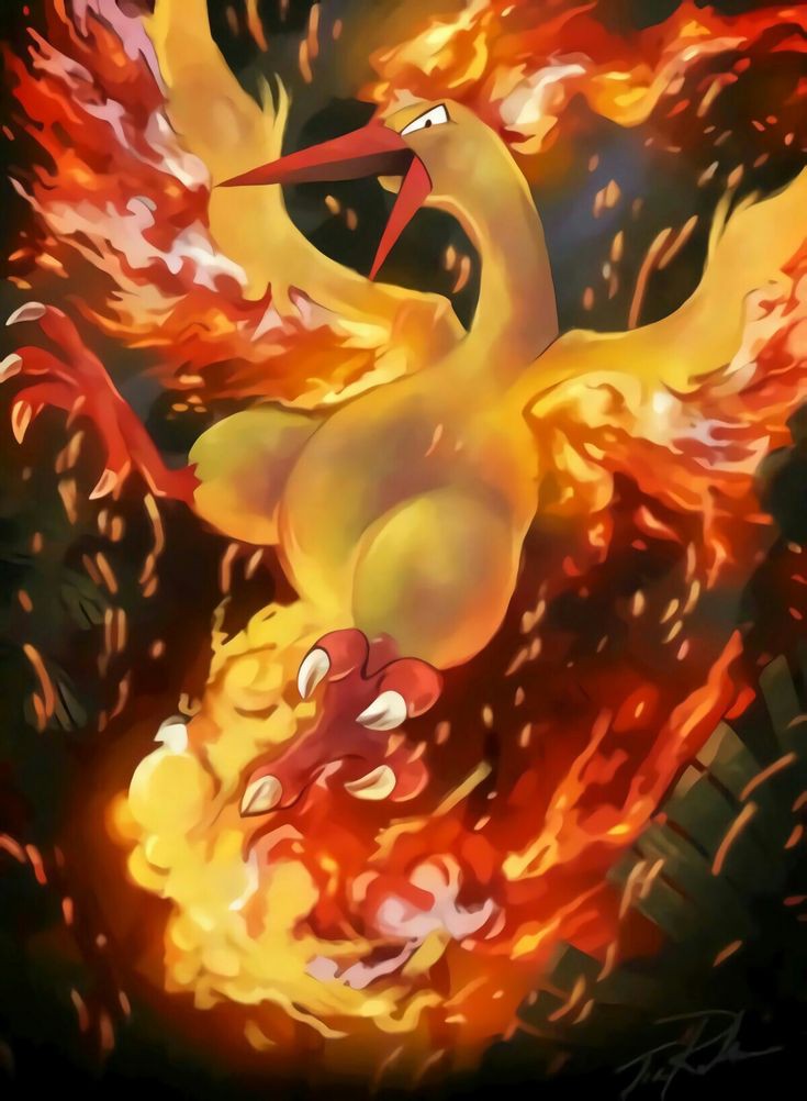 *_Descrição_: Moltres é um Pokémon lendário de tipo Fogo/Voador, venerado como o guardião das chamas e o mais ardente dos três Pássaros Lendários de Kanto. Com um corpo envolto em fogo vivo, suas asas majestosas parecem feitas de puro fogo, brilhando com uma intensidade que ilumina o céu noturno.*