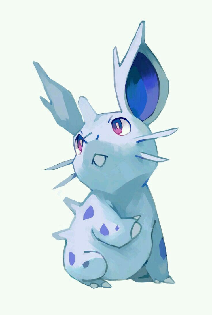 *_Descrição_: Nidoran♀ é um pequeno Pokémon em forma de coelho com grandes bigodes e dentes frontais. Diz-se que se assemelha a Nidoran♂ , mas é azulado e lilás e tem um chifre muito menor na cabeça. Ela tem manchas mais escuras no corpo.*